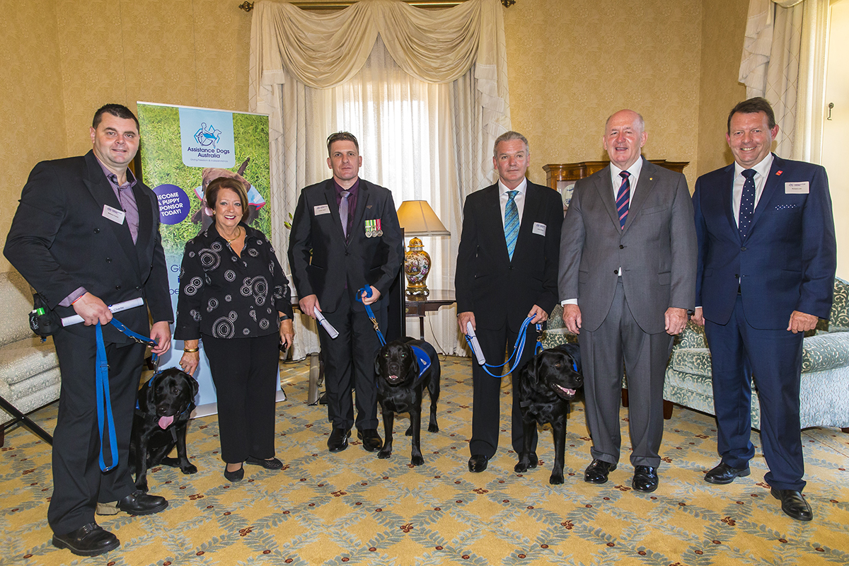 | (left to right) Matthew Connor & Charlie, Lady Cosgrove, Andrew Tebbit & Benji, Sir Peter Cosgrove, Grant Newton & General, Richard Lord - Top Dog at Assistance Dogs Australia |