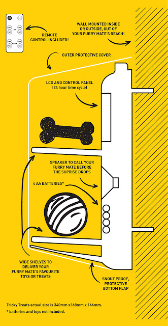 “Tricky Treats is the first device of its kind in the world that dispenses fun and enriching toys and treats from a container mounted on an inside or outside wall of your home, at pre-programmed times,” Ms Holden said.