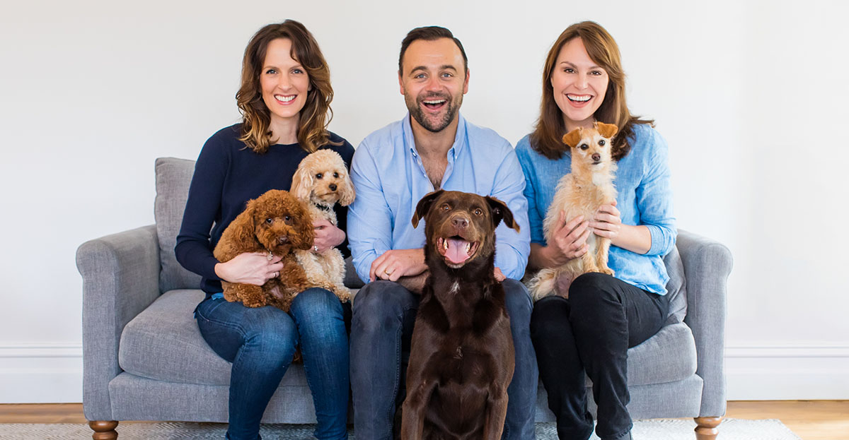 | Resident Vet Dr Melissa Meehan and Co-hosts, Gyton Grantley & Lara Shannon; pooches: Monty & Mia, George & Dynamite Darcy Photo credit: Kerry Martin, Puppy Tales Photography |