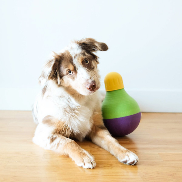 The Bob-a-lot is made of durable materials that are also non-toxic and dishwasher safe, making the toy more convenient to use. The weighted base allows the toy to wobble, tumble and roll as the pet plays with it. This encourages greater interaction from the pet while they try to release the food inside the Bob-a-lot.