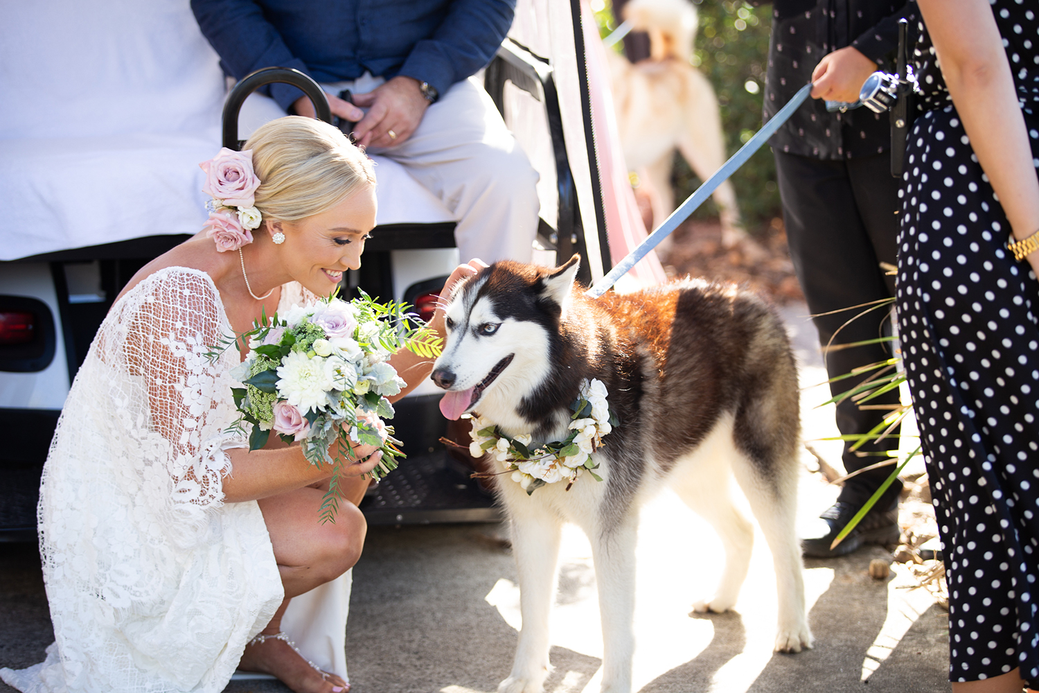 | Jess and Damien's wedding with their Huskies Ayra and Jasper. Photo Credit: By the Pauls |