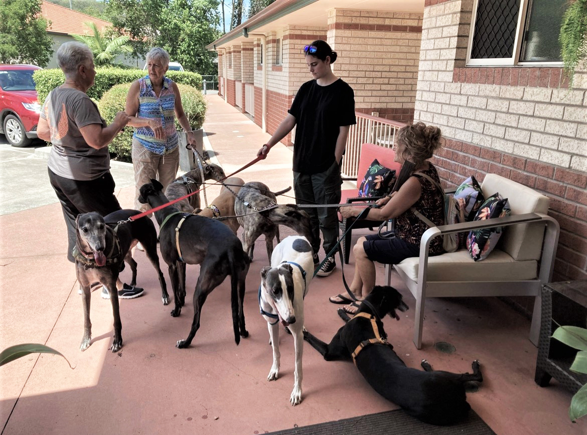 Volunteers with Gumtree Greys in Queensland make regular visits to Lorocco, a nursing home for the aged and disabled in Carindale. Residents love having visitors and you can see the joy in their faces as they pat the friendly hounds and chat to the volunteers.